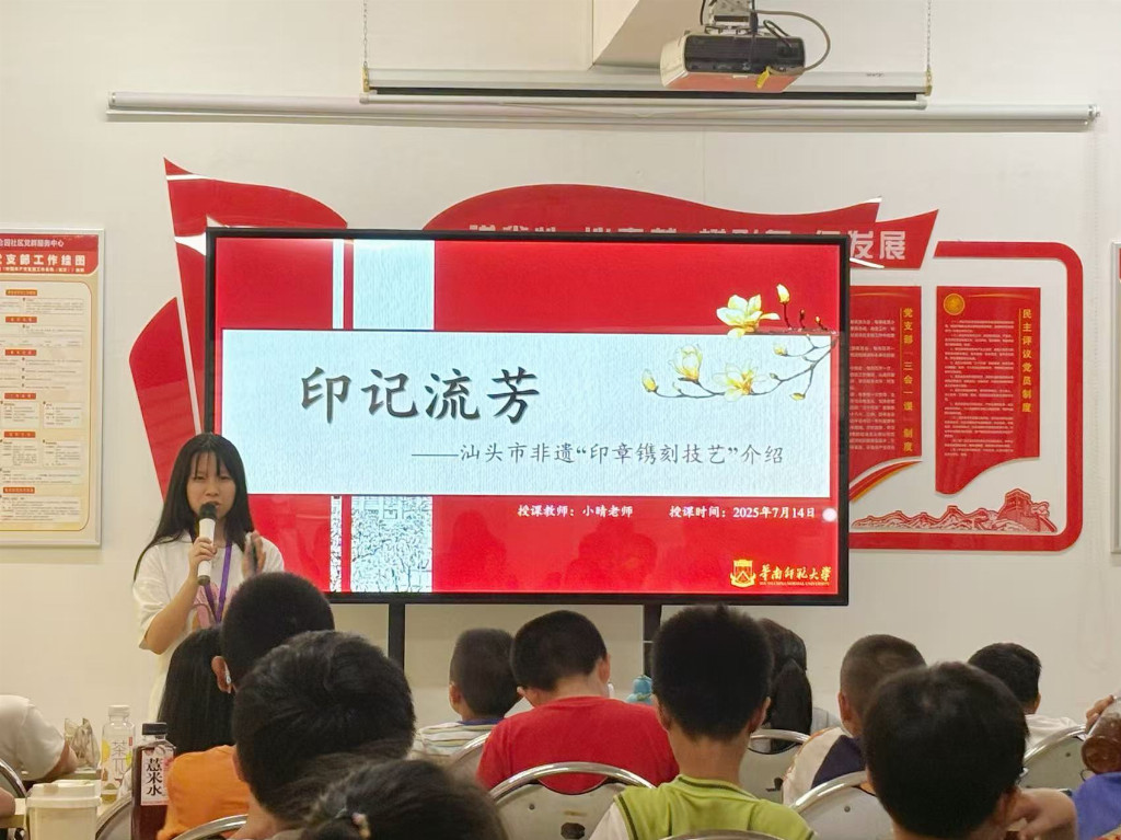 首场课程“印记流芳”以国家级非物质文化遗产“印章镌刻技艺(汕头)”为核心,为小学员们开启了一趟穿越方寸天地的匠心之旅。课程设计严谨而系统,讲师首先从印章在中国社会历史长河中的核心作用讲起——它不仅是权力与身份的凭信,更是文人雅士寄情言志、艺术表达的重要载体。随后,课程将视野聚焦于汕头印章镌刻技艺的独特发展脉络,深入浅出地剖析了本地印章选材(如寿山石、青田石等)的特性与讲究,并着重解构了潮汕流派独特的运刀技法与审美取向。